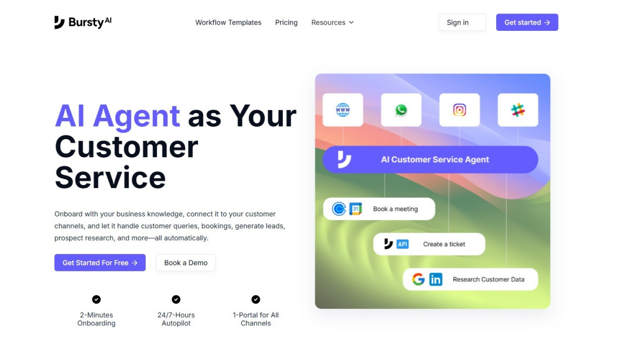 BurstyAI is an AI-powered platform designed to automate customer service, lead generation, SEO content creation, and business workflows without coding. It offers 24/7 AI customer support across multiple channels.