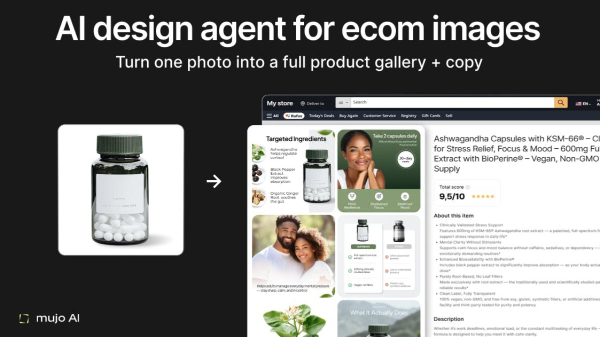 Mujo AI is an AI-powered platform for e-commerce that transforms a single product photo into a complete set of marketing assets, including professional images and optimized copy. It features AI-generated visuals like lifestyle shots and infographics.