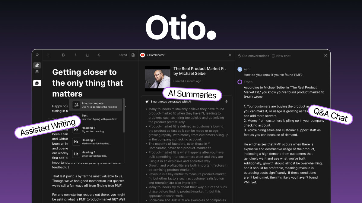 Otio is an AI-powered platform for research and writing that helps users summarize, analyze, and work with documents and web sources. It offers tools for automatic summaries, chatting with documents, AI-assisted drafting and editing, and document comparison.