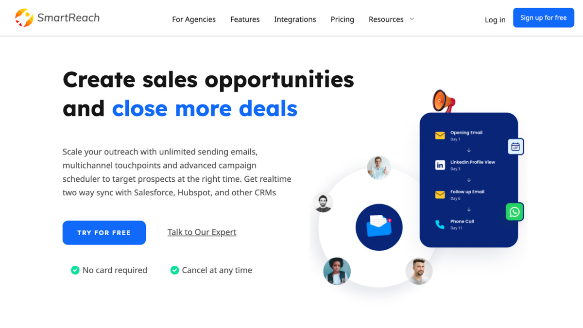 SmartReach is an AI-powered multichannel outreach platform for sales teams and agencies. It offers tools for unlimited cold emailing, LinkedIn and call sequences, advanced scheduling, automated follow-ups, AI-generated content, built-in email verification, and analytics.