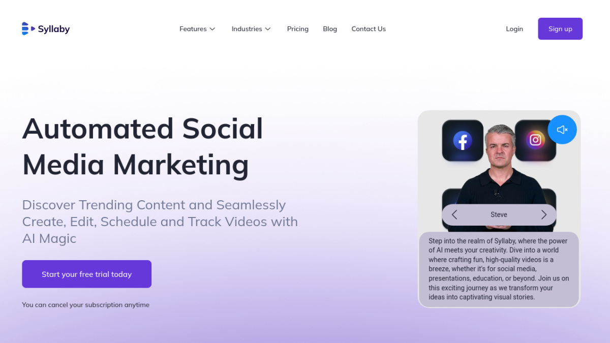 Syllaby is an AI-powered platform for rapidly creating viral social media videos. It helps users discover trending topics, generate scripts, and produces faceless or avatar-based videos with AI voice cloning.
